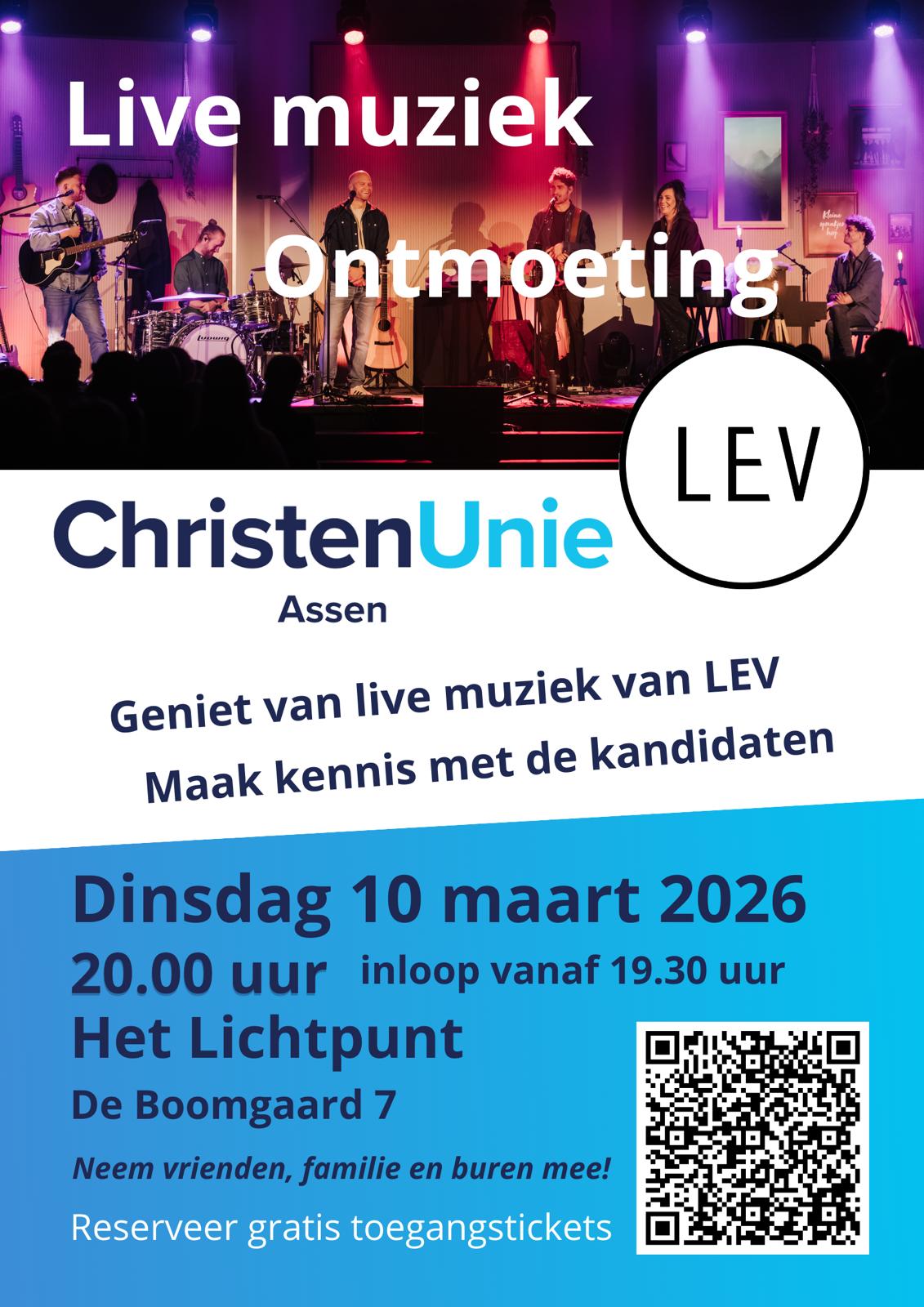 Geniet van live muziek van LEV en maak kennis met de kandidaten op onze kieslijst op dinsdagavond 10 maart 2026 in De Nieuwe Kolk. Het programma start om 20.00 uur, inloop vanaf 19.30 uur.